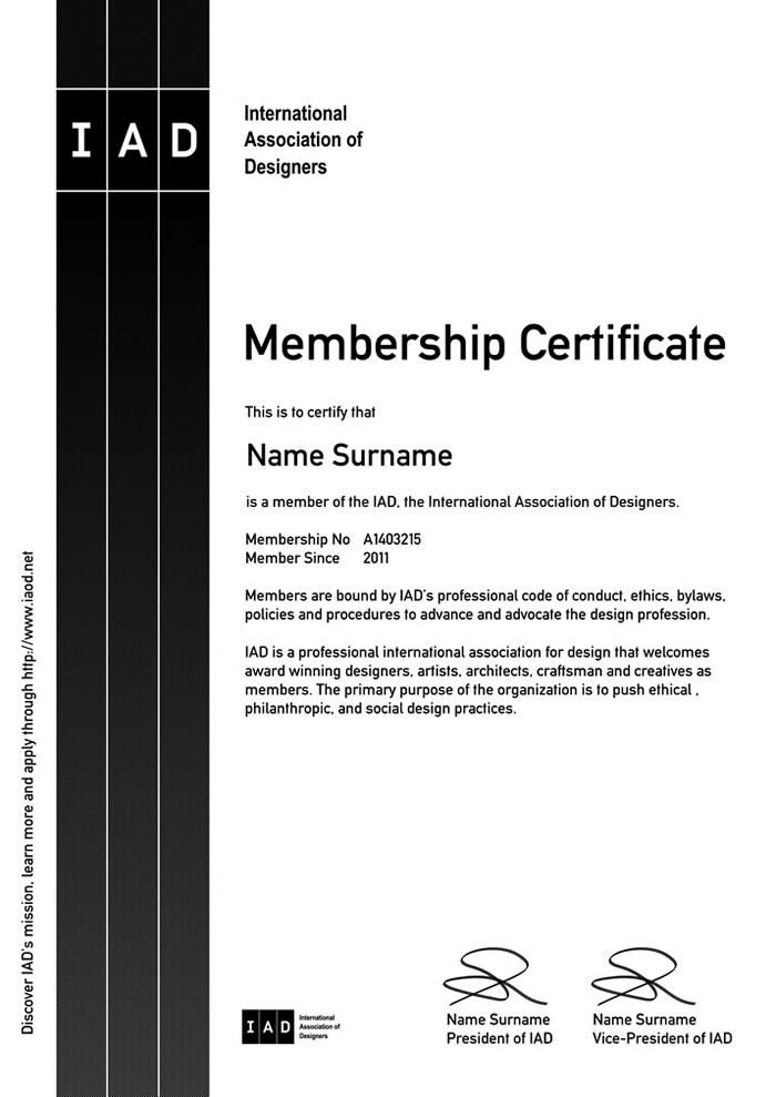 International Association of Designers Members are presented the IAD Membership Certificate personalized to their names. The IAD Member Certificate could be exposed in your office to highlight that you are a member in good standing of the International Association of Designers. Also see: |